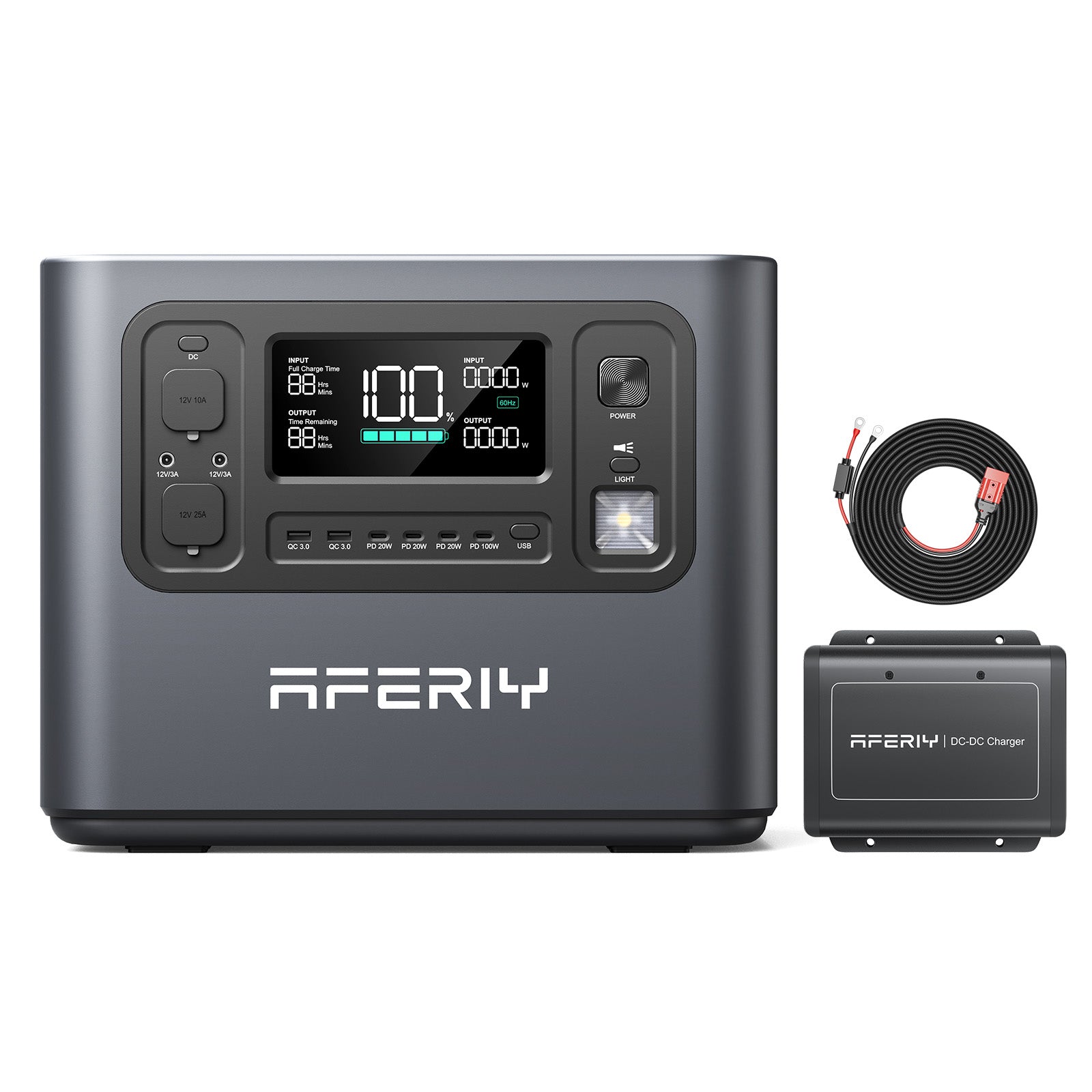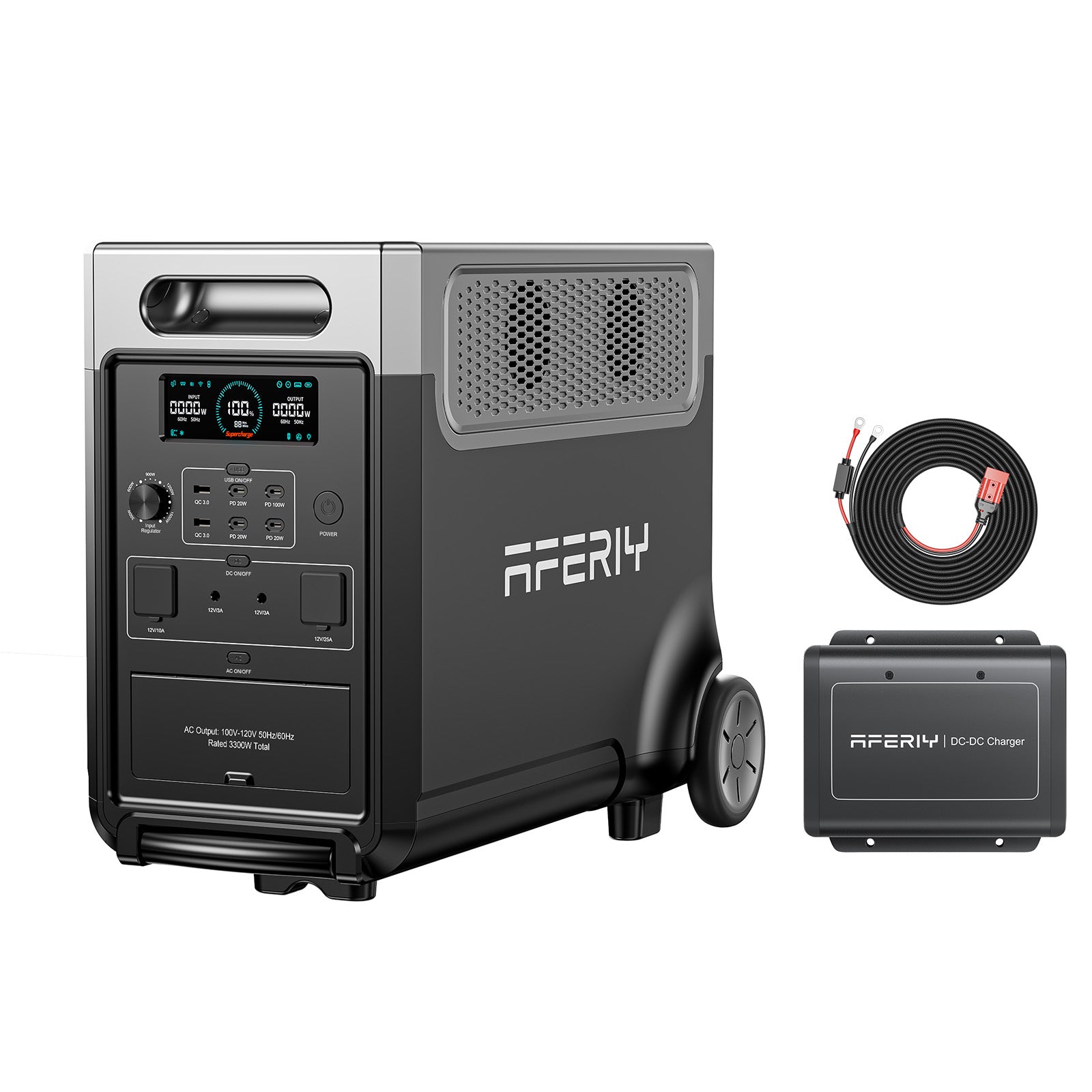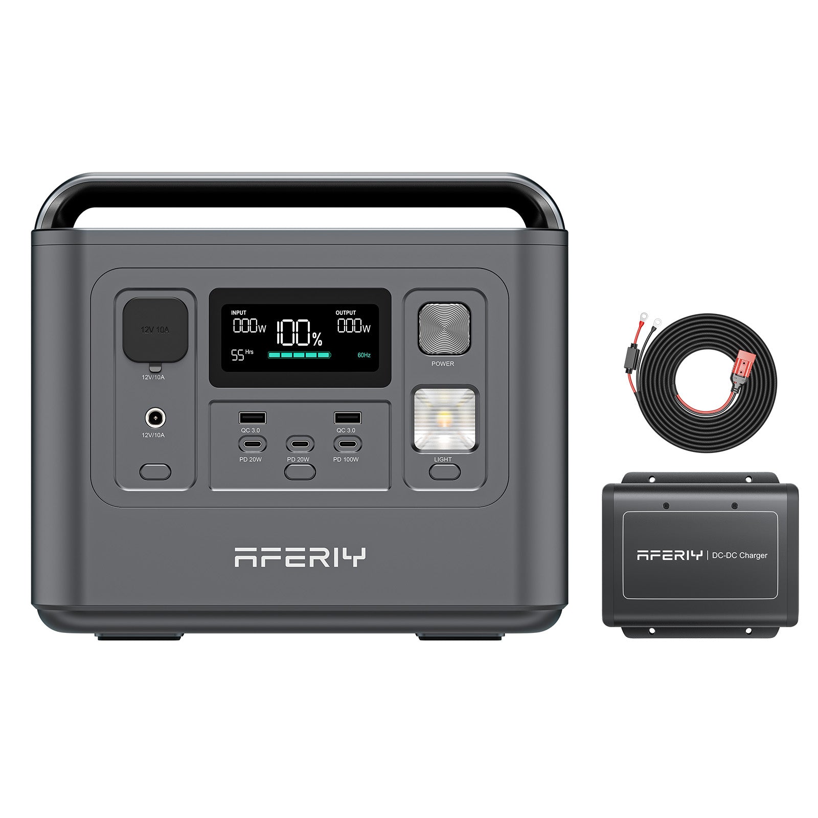 AFERIY DC600 DC-DC Charger, 16.4ft DC input cable, fuse cable, Anderson–MC4 output cable, installation accessories, and user manual.