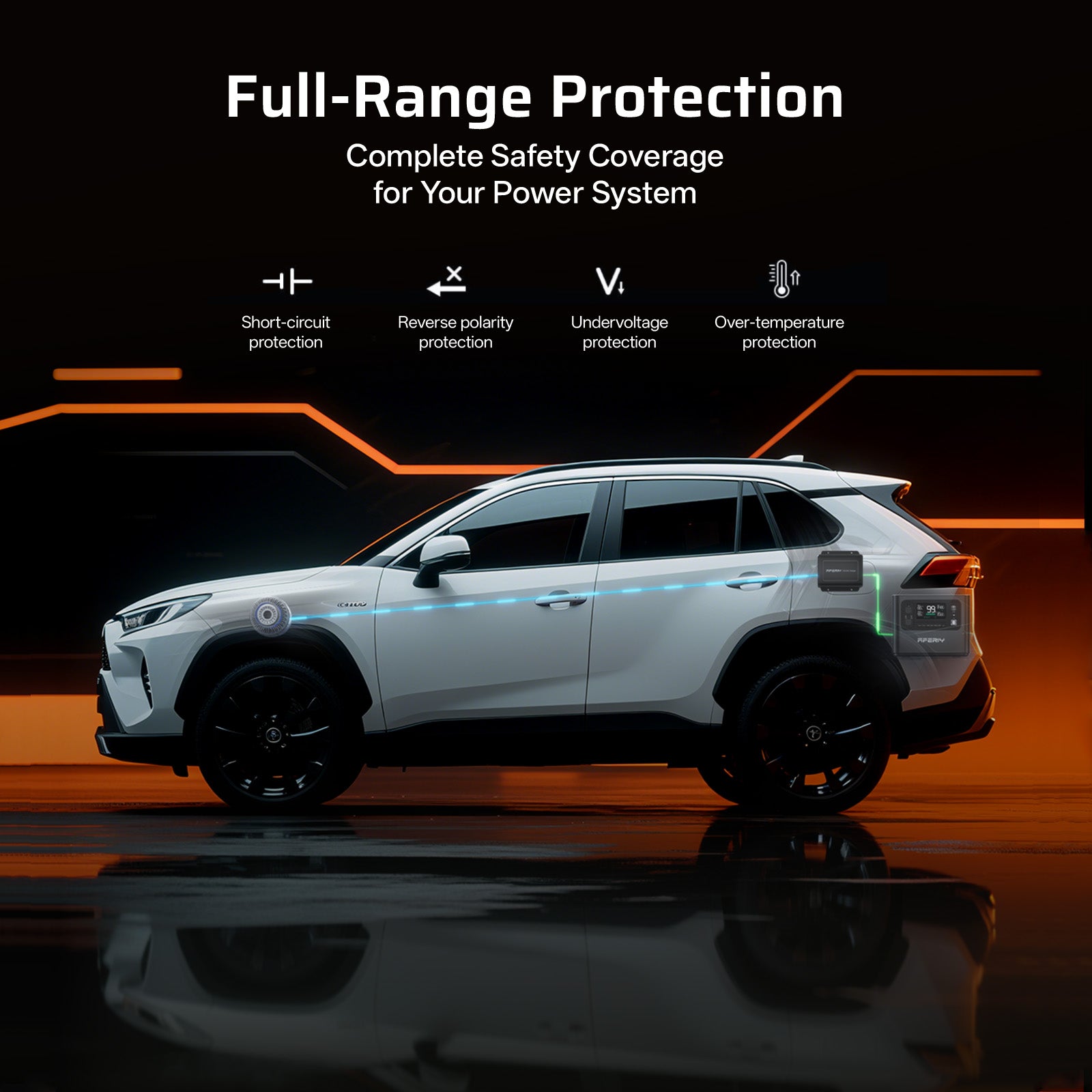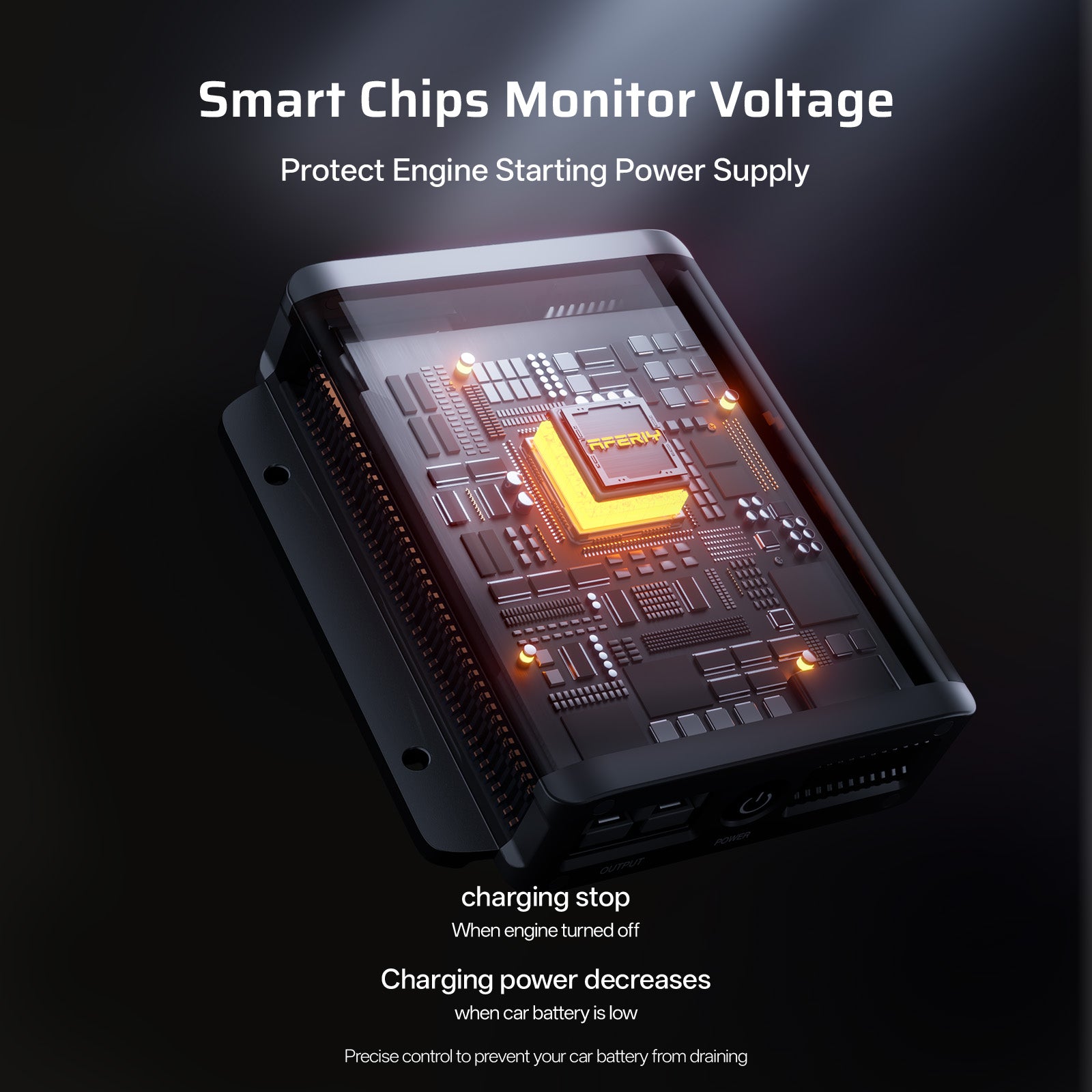 The AFERIY DC600 Charger automatically powers off when the vehicle engine stops, preventing battery drain and ensuring safe, worry-free operation every time.