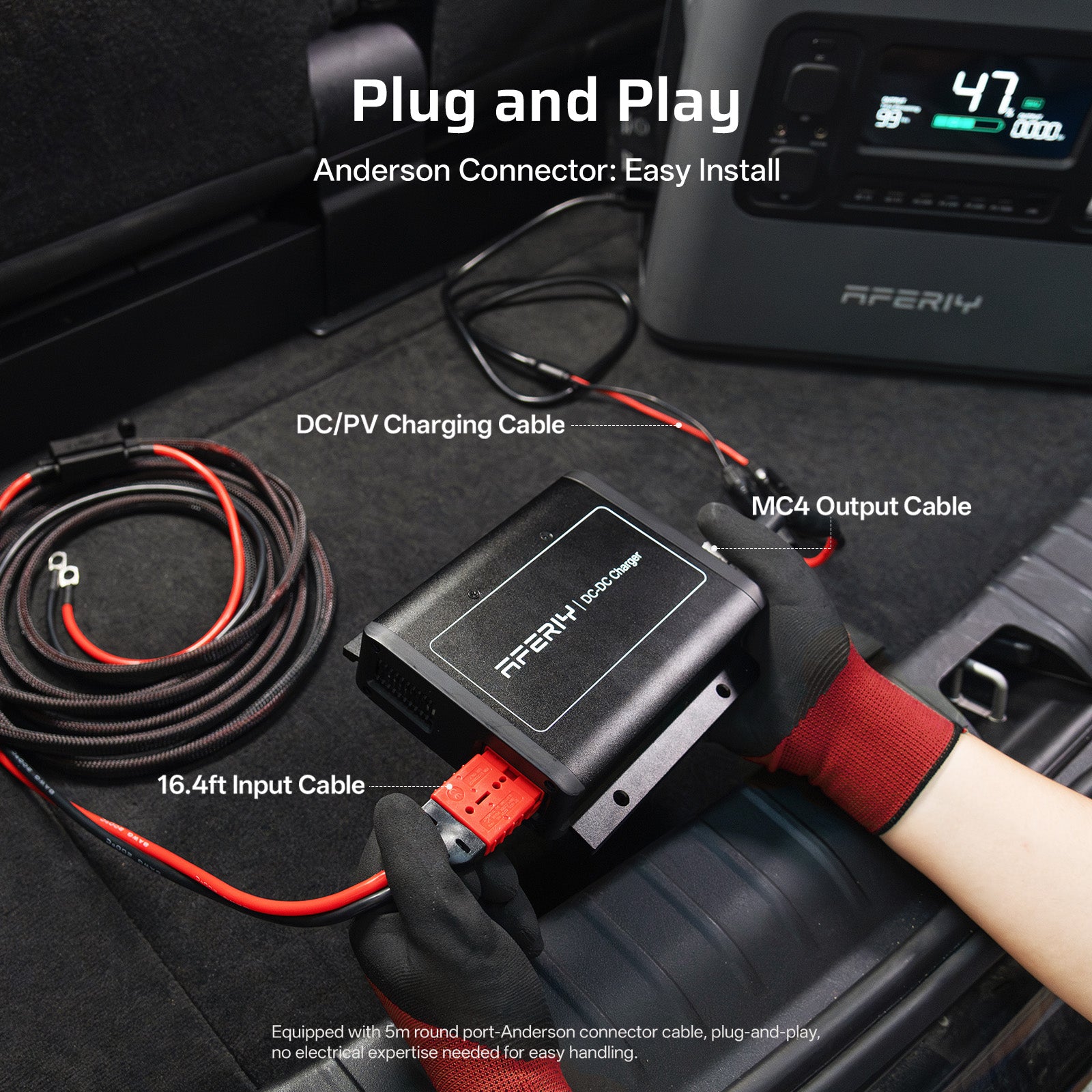 AFERIY DC600 DC-DC Charger, 16.4ft DC input cable, fuse cable, Anderson–MC4 output cable, installation accessories, and user manual.