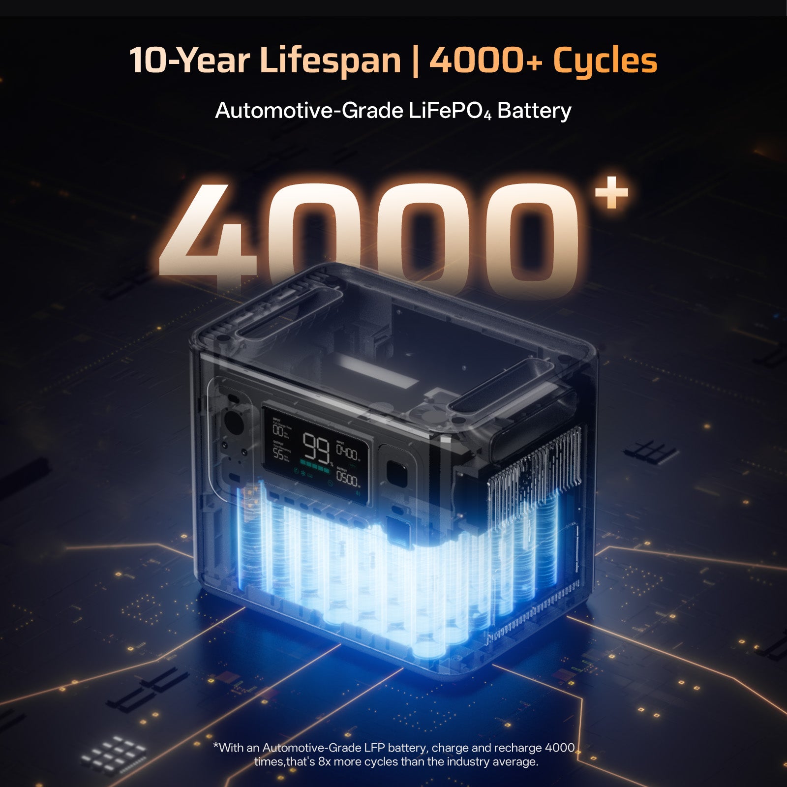 The AF-P280 is powered by premium LiFePO₄ battery cells, delivering over 4000 charge cycles while maintaining more than 80% of original capacity — ensuring up to 11 years of reliable use. Its advanced BMS provides full protection against over-charge, over-discharge, over-voltage, over-current, and over-temperature.