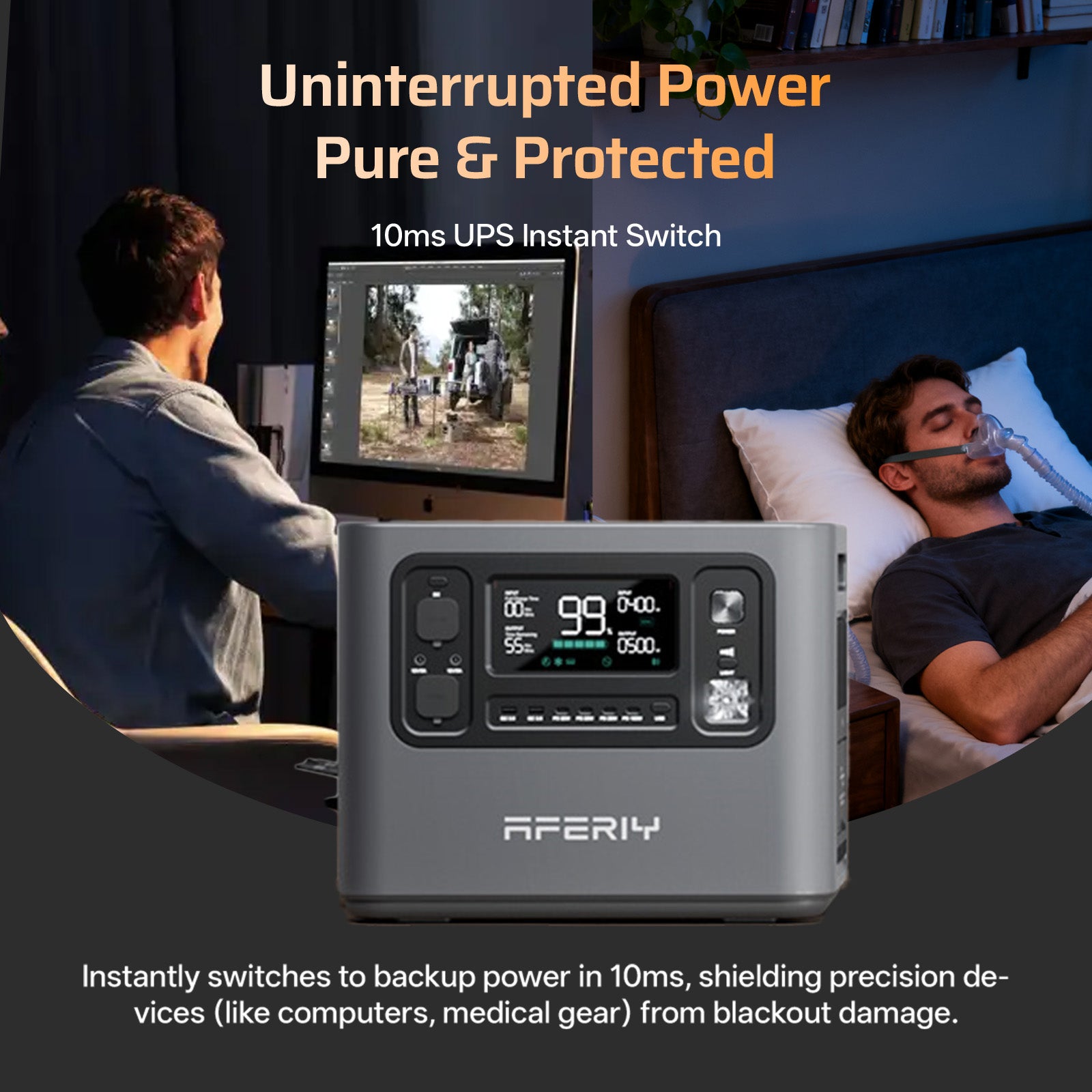 When a sudden power failure, undervoltage, or electrical interference occurs, the AF-P280 automatically switches to battery power within 10 milliseconds. This ensures a stable and uninterrupted AC power supply, keeping your devices running smoothly and safely.